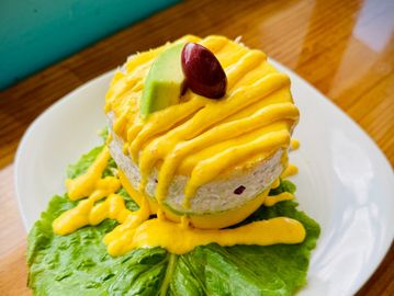 A traditional Peruvian layered dish made with seasoned mashed yellow potatoes, filled with fresh tuna salad, and topped with a touch of avocado and vibrant sauces. A perfect balance of flavor and freshness.