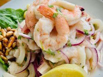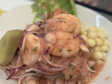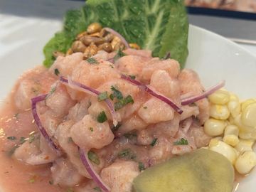 Fresh shrimp marinated in lime juice and tossed with onions, cilantro, and a touch of Peruvian chili. Served with sweet potato and Peruvian corn, this refreshing dish is a coastal classic full of flavor.