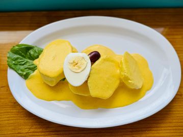 Boiled potatoes served over a creamy Peruvian cheese sauce made with yellow peppers and a hint of spice. Garnished with hard-boiled egg and black olives, this classic appetizer is one of Peru’s most beloved dishes.