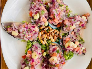Fresh steamed mussels served cold and topped with a zesty mix of onions, tomatoes, Peruvian corn, and lime juice. A refreshing and authentic Peruvian appetizer full of flavor.
